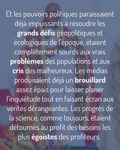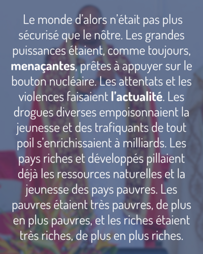 Le monde d’alors n’était pas plus sécurisé que le nôtre. Les grandes puissances étaient, comme toujours, menaçantes, prêtes à appuyer sur le bouton nucléaire. Les attentats et les violences faisaient l’actualité. Les drogues diverses empoisonnaient la jeunesse et des trafiquants de tout poil s’enrichissaient à milliards. Les pays riches et développés pillaient déjà les ressources naturelles et la jeunesse des pays pauvres. Les pauvres étaient très pauvres, de plus en plus pauvres, et les riches étaient très riches, de plus en plus riches. Et les pouvoirs politiques paraissaient déjà impuissants à résoudre les grands défis géopolitiques et écologiques de l’époque, étaient complètement sourds aux vrais problèmes des populations et aux cris des malheureux. Les médias produisaient déjà un brouillard assez épais pour laisser planer l’inquiétude tout en faisant écran aux vérités dérangeantes. Les progrès de la science, comme toujours, étaient détournés au profit des besoins les plus égoïstes des profiteurs. On inventait alors nos actuels moyens légaux de se débarrasser légalement de ceux qui gênaient la jouissance permanente des hommes : enfants à naître, pauvres grabataires, ou porteurs de handicaps…