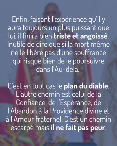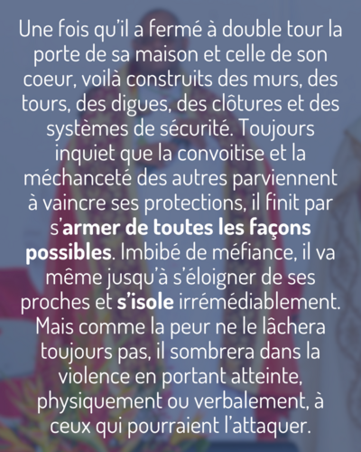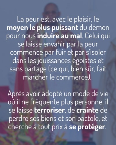 La peur est, avec le plaisir, le moyen le plus puissant du démon pour nous induire au mal. Celui qui se laisse envahir par la peur commence par fuir et par s’isoler dans les jouissances égoïstes et sans partage (ce qui, bien sûr, fait marcher le commerce). Après avoir adopté un mode de vie où il ne fréquente plus personne, il se laisse terroriser, de crainte de perdre ses biens et son pactole, et cherche à tout prix à se protéger. Une fois qu’il a fermé à double tour la porte de sa maison et celle de son coeur, voilà construits des murs, des tours, des digues, des clôtures et des systèmes de sécurité. Toujours inquiet que la convoitise et la méchanceté des autres parviennent à vaincre ses protections, il finit par s’armer de toutes les façons possibles. Imbibé de méfiance, il va même jusqu’à s’éloigner de ses proches et s’isole irrémédiablement. Mais comme la peur ne le lâchera toujours pas, il sombrera dans la violence en portant atteinte, physiquement ou verbalement, à ceux qui pourraient l’attaquer. Enfin, faisant l’expérience qu’il y aura toujours un plus puissant que lui, il finira bien triste et angoissé. Inutile de dire que si la mort même ne le libère pas d’une souffrance qui risque bien de le poursuivre dans l’Au-delà. C’est en tout cas le plan du diable.