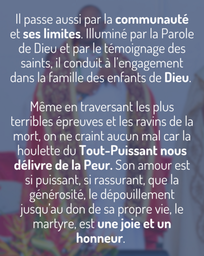 L’autre chemin est celui de la Confiance, de l’Espérance, de l’Abandon à la Providence divine et à l’Amour fraternel. C’est un chemin escarpé mais il ne fait pas peur. Il passe aussi par la communauté et ses limites. Illuminé par la Parole de Dieu et par le témoignage des saints, il conduit à l’engagement dans la famille des enfants de Dieu. Même en traversant les plus terribles épreuves et les ravins de la mort, on ne craint aucun mal car la houlette du Tout-Puissant nous délivre de la Peur. Son amour est si puissant, si rassurant, que la générosité, le dépouillement jusqu’au don de sa propre vie, le martyre, est une joie et un honneur. La victoire sur la peur est une victoire définitive. L’union éternelle à Celui qui a dit : « N’ayez pas peur, j’ai vaincu le monde » (Jn 16,33).
