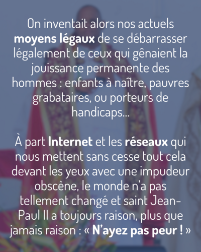 À part Internet et les réseaux qui nous mettent sans cesse tout cela devant les yeux avec une impudeur obscène, le monde n’a pas tellement changé et saint Jean-Paul II a toujours raison, plus que jamais raison : « N’ayez pas peur ! »
