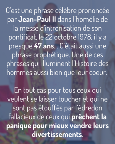 C’est une phrase célèbre prononcée par Jean-Paul II dans l’homélie de la messe d’intronisation de son pontificat, le 22 octobre 1978, il y a presque 47 ans… C’était aussi une phrase prophétique. Une de ces phrases qui illuminent l’Histoire des hommes aussi bien que leur coeur. En tout cas pour tous ceux qui veulent se laisser toucher et qui ne sont pas étouffés par l’édredon fallacieux de ceux qui prêchent la panique pour mieux vendre leurs divertissements.