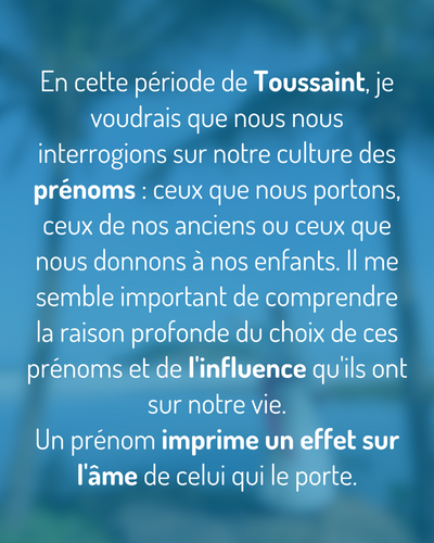 En cette période de Toussaint, je voudrais que nous nous interrogions sur notre culture des prénoms : ceux que nous portons, ceux de nos anciens ou ceux que nous donnons à nos enfants. Il me semble important de comprendre la raison profonde du choix de ces prénoms et de l'influence qu'ils ont sur notre vie.