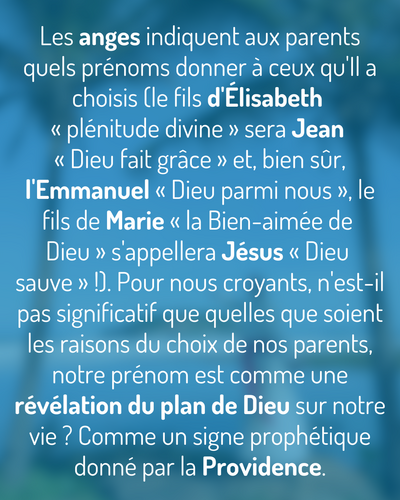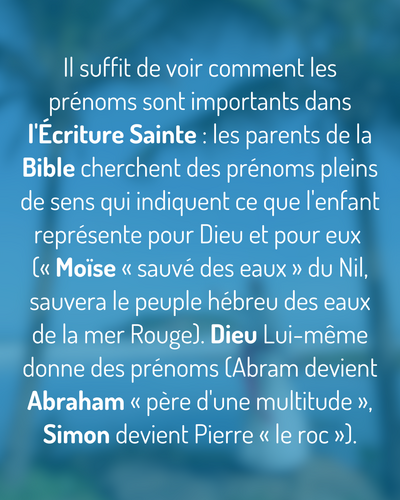 Il suffit de voir comment les prénoms sont importants dans l'Écriture Sainte : les parents de la Bible cherchent des prénoms pleins de sens qui indiquent ce que l'enfant représente pour Dieu et pour eux (« Moïse « sauvé des eaux » du Nil, sauvera le peuple hébreu des eaux de la mer Rouge). Dieu Lui-même donne des prénoms (Abram devient Abraham « père d'une multitude », Simon devient Pierre « le roc »). Les anges indiquent aux parents quels prénoms donner à ceux qu'Il a choisis (le fils d'Élisabeth « plénitude divine » sera Jean « Dieu fait grâce » et, bien sûr, l'Emmanuel « Dieu parmi nous », le fils de Marie « la Bien-aimée de Dieu » s'appellera Jésus « Dieu sauve » !). Pour nous croyants, n'est-il pas significatif que quelles que soient les raisons du choix de nos parents, notre prénom est comme une révélation du plan de Dieu sur notre vie ? Comme un signe prophétique donné par la Providence.