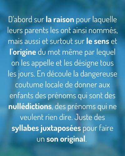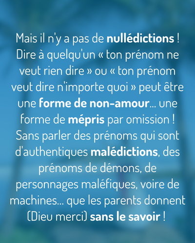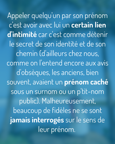 Appeler quelqu'un par son prénom c'est avoir avec lui un certain lien d'intimité car c'est comme détenir le secret de son identité et de son chemin (d'ailleurs chez nous, comme on l'entend encore aux avis d'obsèques, les anciens, bien souvent, avaient un prénom caché sous un surnom ou un p'tit-nom public). Malheureusement, beaucoup de fidèles ne se sont jamais interrogés sur le sens de leur prénom. D'abord sur la raison pour laquelle leurs parents les ont ainsi nommés, mais aussi et surtout sur le sens et l'origine du mot même par lequel on les appelle et les désigne tous les jours. En découle la dangereuse coutume locale de donner aux enfants des prénoms qui sont des nullédictions, des prénoms qui ne veulent rien dire. Juste des syllabes juxtaposées pour faire un son original. Mais il n'y a pas de nullédictions ! Dire à quelqu'un « ton prénom ne veut rien dire » ou « ton prénom veut dire n'importe quoi » peut être une forme de non-amour... une forme de mépris par omission ! Sans parler des prénoms qui sont d'authentiques malédictions, des prénoms de démons, de personnages maléfiques, voire de machines… que les parents donnent (Dieu merci) sans le savoir ! Enfin, à cause de l'école et de l'État laïcards et de l'armée qui uniformise, on a pris la mauvaise habitude, même à l'Église (!), de décliner notre identité en commençant par le nom de famille. C'est une forme de dépersonnalisation et de négation du baptême, du plan de Dieu sur les personnes.
