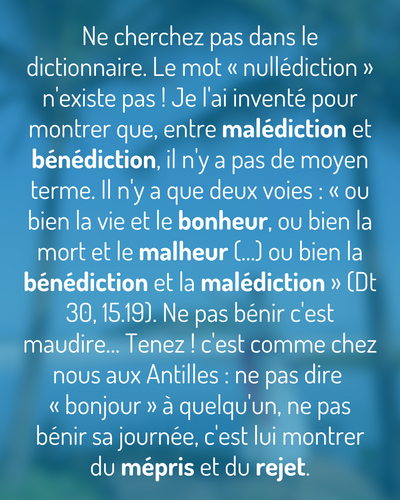 Ne cherchez pas dans le dictionnaire. Le mot « nullédiction » n'existe pas ! Je l'ai inventé pour montrer que, entre malédiction et bénédiction, il n'y a pas de moyen terme. Il n'y a que deux voies : « ou bien la vie et le bonheur, ou bien la mort et le malheur (…) ou bien la bénédiction et la malédiction » (Dt 30, 15.19). Ne pas bénir c'est maudire… Tenez ! c'est comme chez nous aux Antilles : ne pas dire « bonjour » à quelqu'un, ne pas bénir sa journée, c'est lui montrer du mépris et du rejet.