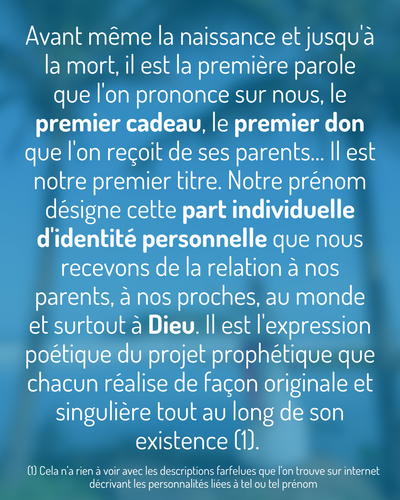 Un prénom imprime un effet sur l'âme de celui qui le porte. Avant même la naissance et jusqu'à la mort, il est la première parole que l'on prononce sur nous, le premier cadeau, le premier don que l'on reçoit de ses parents… Il est notre premier titre. Notre prénom désigne cette part individuelle d'identité personnelle que nous recevons de la relation à nos parents, à nos proches, au monde et surtout à Dieu. Il est l'expression poétique du projet prophétique que chacun réalise de façon originale et singulière tout au long de son existence (1).